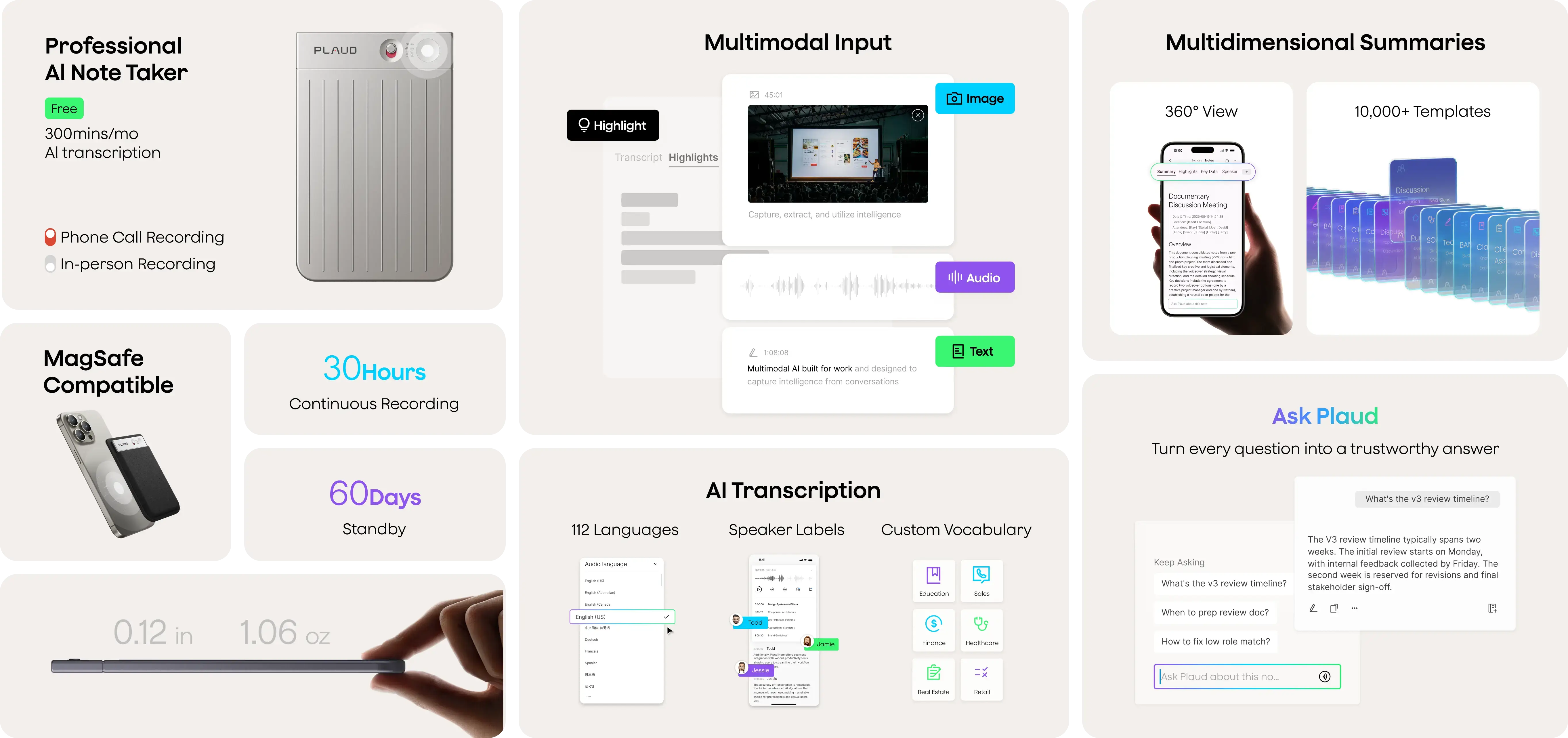 Plaud captures spoken words, typed notes, images, and highlights. Plaud Intelligence, powered by advanced LLMs, unifies them into a complete, organized summary so what matters most always stands out clearly and in context.